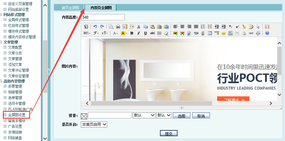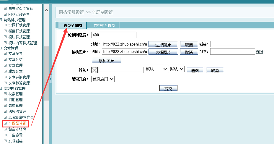 登陆网站后台》高级内容管理》全屏图设置》首页全屏图