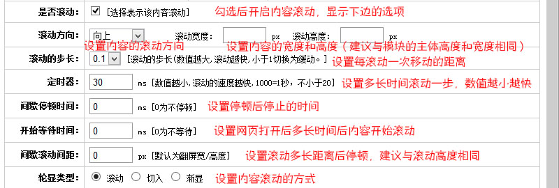 滚动宽度,滚动高度:设置滚动内容的宽度和高度(建议与模块主体大小相同)