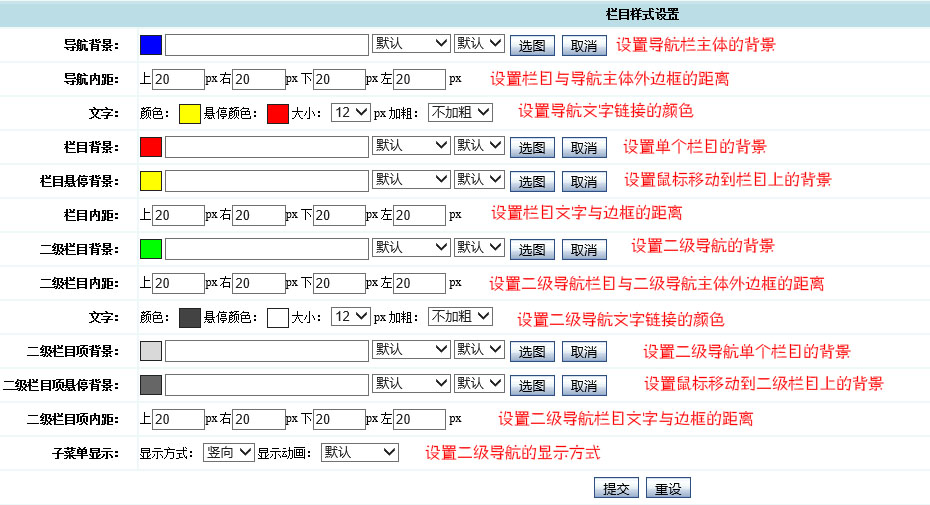 二级栏目项内距:设置二级导航栏目文字与边框的距离