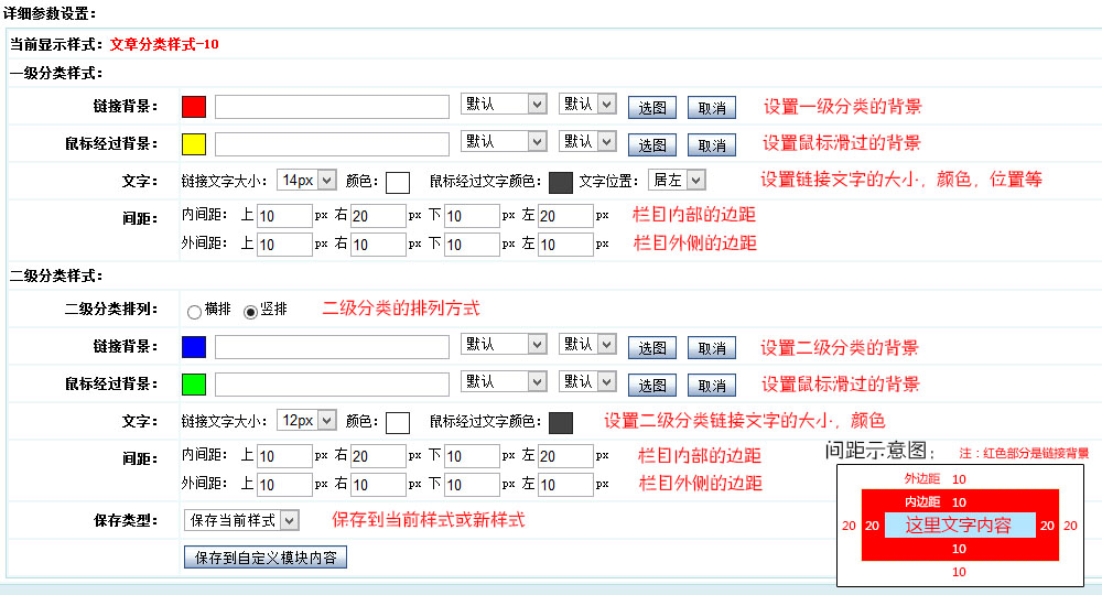 链接背景:设置一级分类栏目的背景 鼠标经过背景:设置鼠标滑过的背景 文字:设置链接文字的属性 间距: