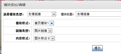 首页要添加一个友情链接模块,添加时选择模块类型为友情链接,填写好模块标题,选择好是文字链接或者是图片链接(添加图片链接时图片要上传到网络硬盘中哦!),及模块样式、内容样式,如图所示: