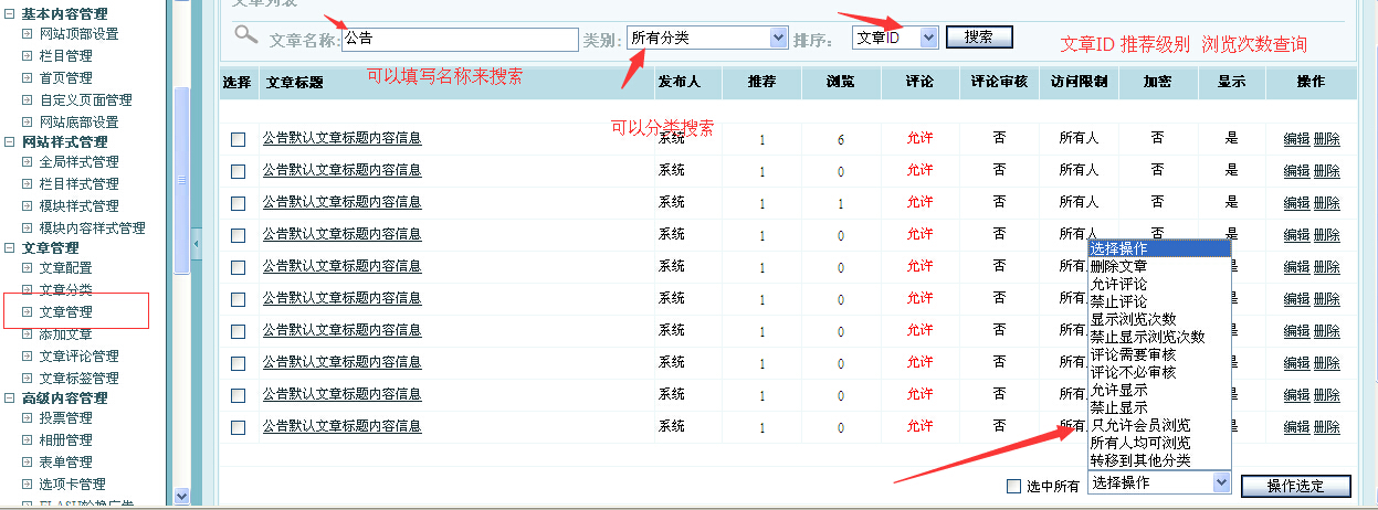 文章管理:如果更改文章管理的内容 直接点击操作中的编辑就可以了