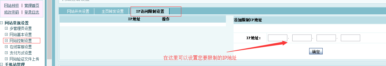 IP访问限制设置:这个功能为了防止某个IP的恶意访问。您按图片上显示的设置好后在访问受限IP列表里就可以看到了,每台上网的电脑会有一个公网IP,限制后属于该上网IP的客户打开您的网站将无法正常访问。