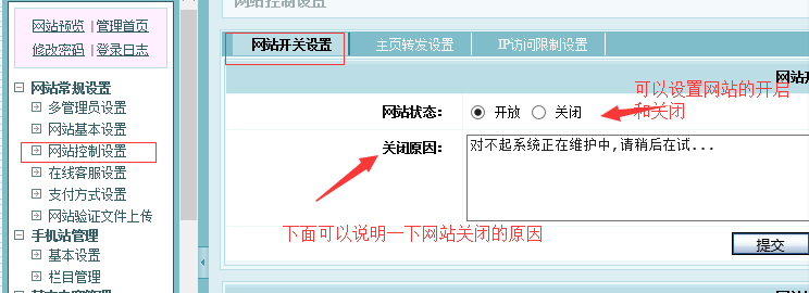 网站开关设置:网站需要临时维护内容需要关闭的时候可以进行设置