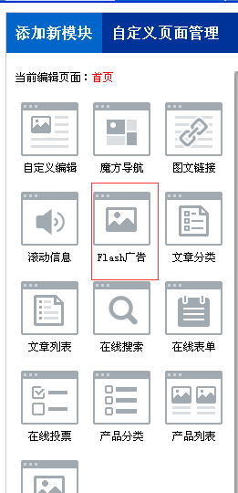 首先,在手机管理面板左侧》添加新模块,选择FLASH广告