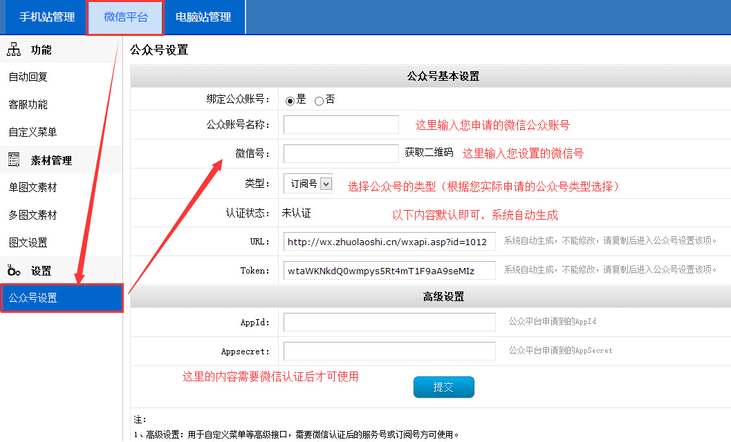 设置好微信公众账号和类型后提交即可